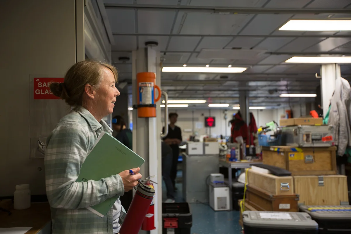 Our conversation shifts to weather, GoPros, 360 action cameras, and the off-chance of flying a drone around the ship. In the corner of my eye, I caught one of those familiar faces I had seen earlier in the morning. Kate Stafford, marine mammal scientist, walked by the lab with binoculars around her neck. Compared to my disheveled state, Kate looked refreshed and invigorated. She had been up the previous night up in the bridge scanning the placid seas for any hint of marine mammal activity while Sikuliaq was in transit.
