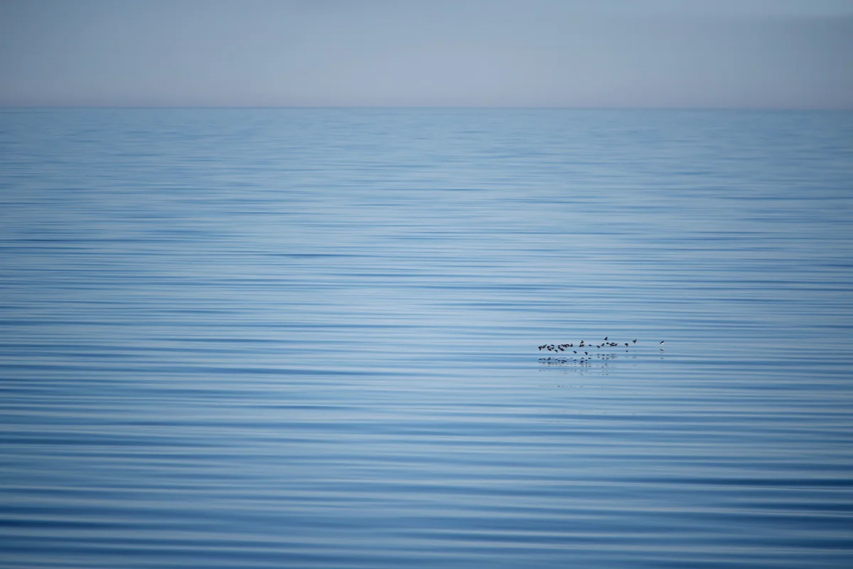 A flock of crested auklets flying in a cluster along the flat, calm sea towards the end of the evening. Photo credit: Brendan Smith